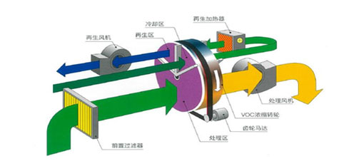 ● 工作原理与流程(三区划分)1. 吸附区:占总面积最大(通常10区/12区)。 过程:含有低浓度VOCs的大风量废气在风机作用下,穿过缓慢旋转的沸石转轮。 原理:沸石具有巨大的比表面积和规则的微孔结构,VOCs分子被其强大的表面力(主要是范德华力)牢牢吸附在孔道内。 结果:干净的空气(达标)从转轮另一侧排出,VOCs被“截留”在转轮上,这是浓缩过程的第一步。