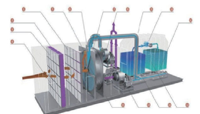 2. 脱附区:占总面积较小(通常1区/12区)。 过程:一小股高温(通常180-220℃)、低流量的净化废气(称为“脱附风”)反向吹扫转轮上已吸附饱和的扇区。 原理:高温提供了能量,破坏了吸附平衡,使VOCs分子从沸石上脱离(脱附)出来,进入这股热空气中。 结果:原本大风量、低浓度的废气,被转化为小风量、高浓度的废气(浓缩气),这是浓缩过程的关键步骤。 3. 冷却区:占总面积很小(通常1区/12区)。 过程:经过高温脱附后的转轮扇区温度很高,吸附能力会下降,用一股常温废气或洁净空气将其冷却至接近工作温度。 原理:恢复沸石的最佳吸附性能,为重新进入吸附区做好准备。 结果:转轮完成一个完整的“吸附→脱附→冷却→再吸附”的循环。整个转轮在电动机驱动下以1-6转/小时的速度缓慢旋转,周而复始地完成连续循环。 4. 后续处理 从脱附区排出的高浓度废气,会被引入一个最终处理单元,例如:蓄热式焚烧炉(利用其高浓度,在高温下彻底氧化分解为CO₂和H₂O,热能可回收利用);催化燃烧装置(在催化剂作用下低温燃烧,更节能);冷凝回收装置(对于有回收价值的溶剂,可进行冷凝液化回收)。 ● 核心技术特点